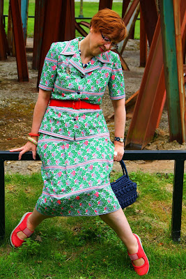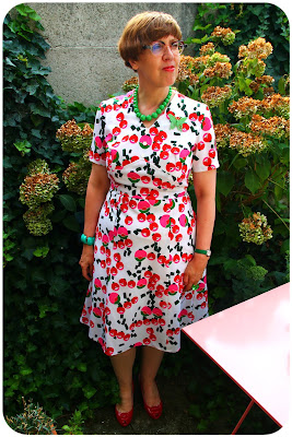 I was wearing my vintage Venetia frock, which has a pattern of tiny white dots and garlands of frothy pink flowers, and was purchased from a long-gone vintage shop about 12 years ago.