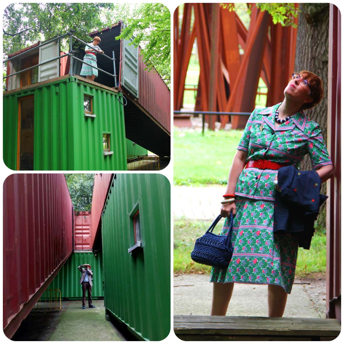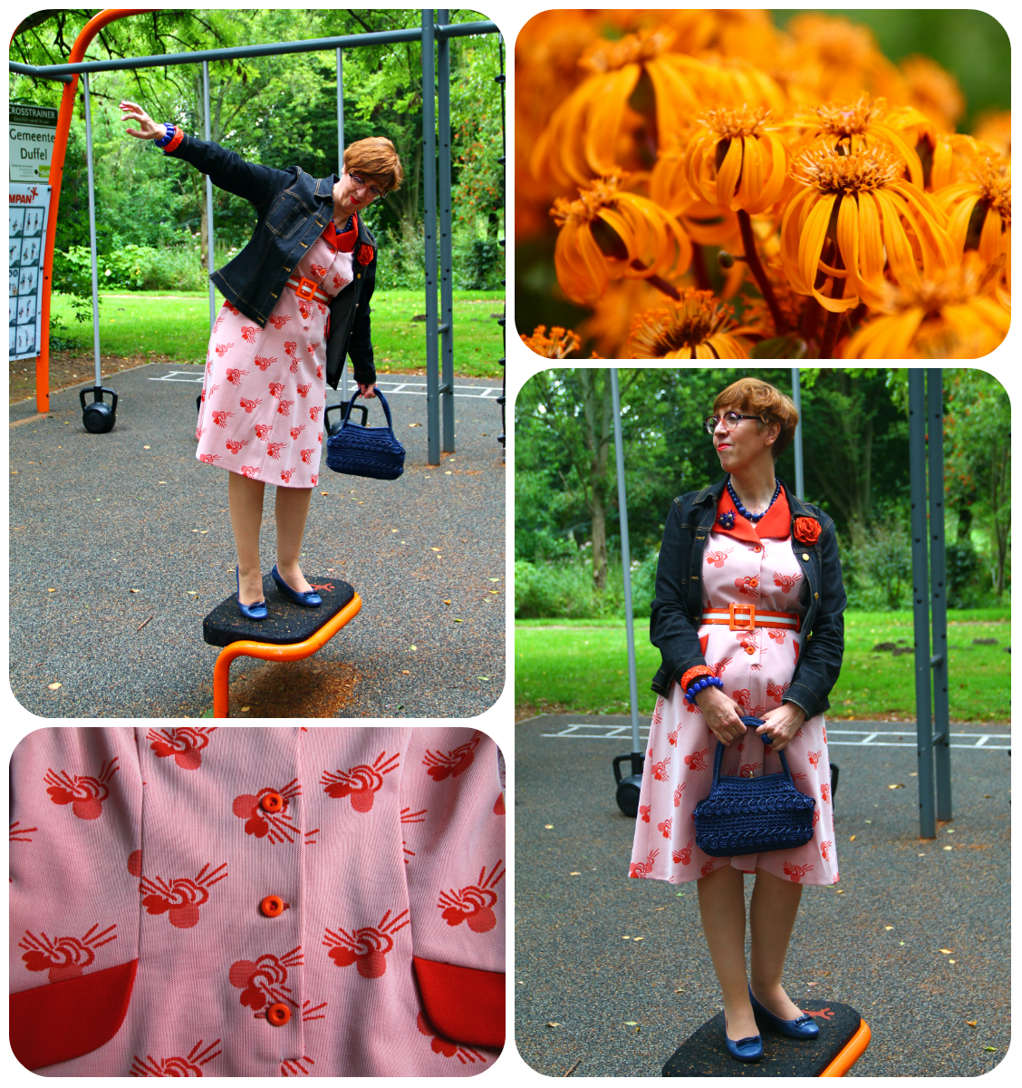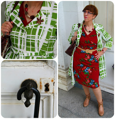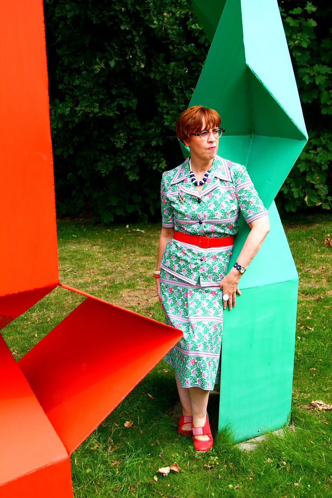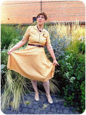 Let's have a look at the symphony of blue, red and white I was wearing that day. The skirt is vintage and was part of a birthday haul at Think Twice in September 2020. The spotty blouse is from the former Belgian Wow To Go label and was charity shopped almost exactly two years later. My necklace, another one which is making regular appearances here, was a charity shop find as well, while the elastic belt with its Celtic knot buckle was picked up from the Green Ice outlet shop near my office.