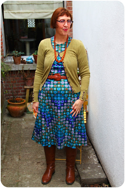 Apart from my secretly matching purple opaques hidden by my boots, I opted for caramel accessories to match some of the dots in the dress's pattern. So, out came my mock-croc belt (retail), beaded necklace (charity shopped) and perspex ring from Rita's flea market stall. I've seen the brooch being offered as vintage on more than one occasion, but it is actually from H&M, where I bought mine brand new in the early noughties.
